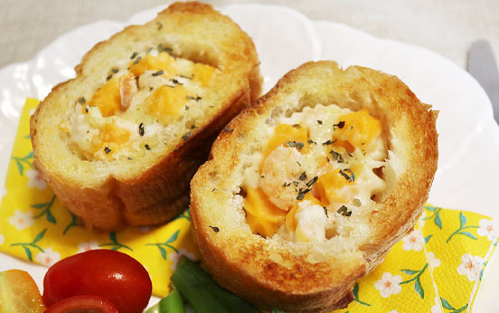 えびとチーズのグラタンを、紙カップから外し、スプーン等を使ってフランスパンのくぼみに入れる。