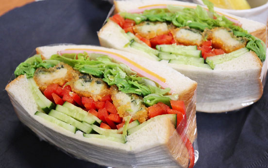 - バターを塗った食パンに、チーズ・ハム・レタス・ささみカツ・パプリカ・きゅうり等を順番に並べ、マヨネーズ、塩コショウを振り、最後に食パンを被せラップで包む。
