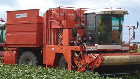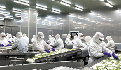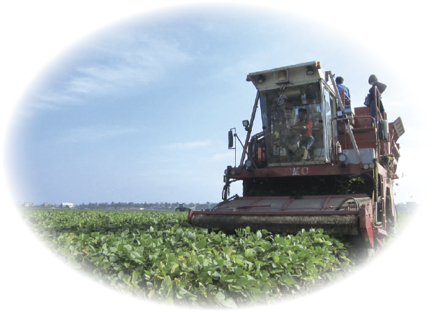 ⼤型ハーベスターによる短時間収穫後、⼯場に運ばれ、短時間で冷凍加工が行われるため、収穫後の鮮度が保たれ、美味しいえだまめが出来上がります。