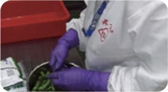 えだまめ原料のグレード分けをおこない、⾍混⼊の可能性がある原料は使⽤しません。