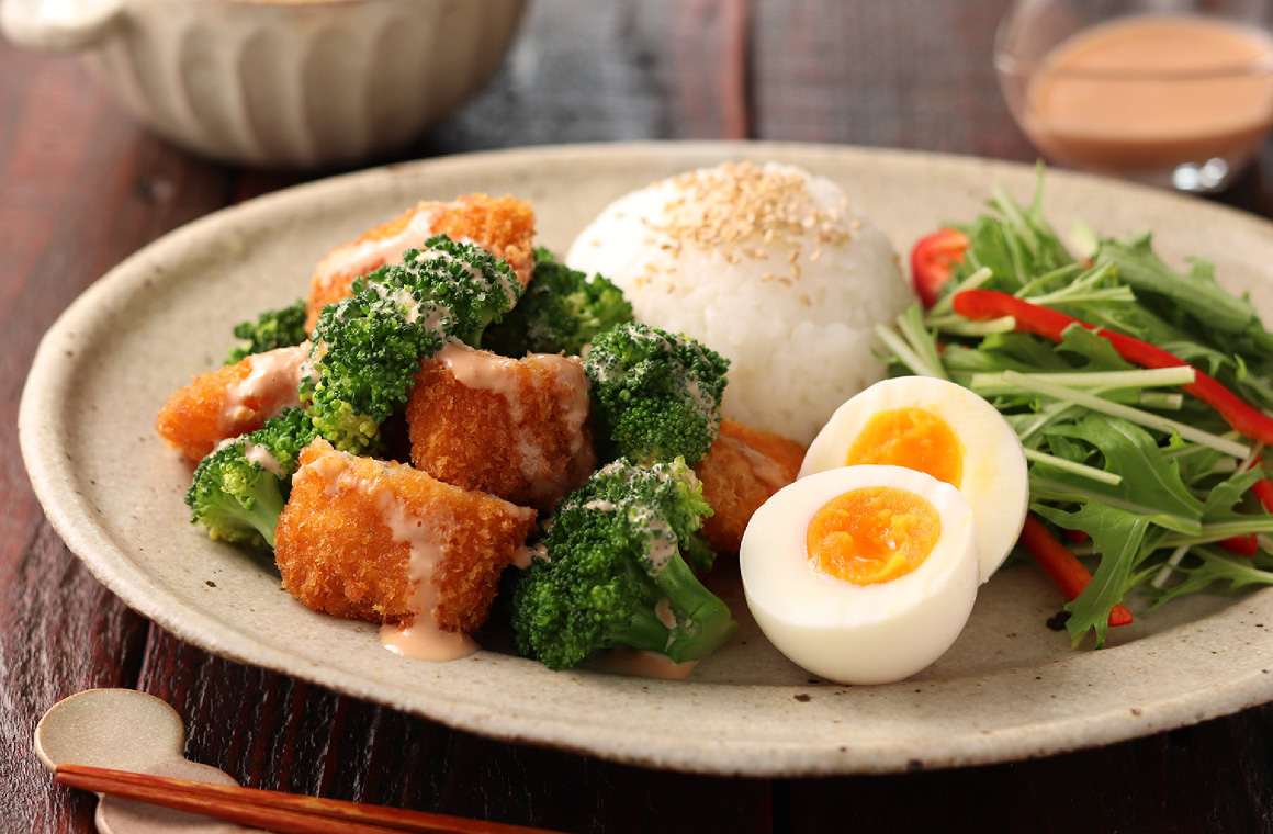 レンジでチン!ソースをかけるだけで、一気にカフェ風ご飯に大変身。オーロラソース風のマヨソースで野菜もモリモリ食べられます。また、ソースは和えるのではなく、あえてかけることでフライそのものの味も楽しめます。